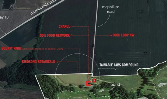 Tainable’s mission is to transform agricultural lands into community-designed collaboration hubs that advance soil health, strengthen local food security, and promote responsible resource stewardship. Founded by environmentalist and farmer Ramsey McPhillips, Tainable operates at the historic 1862 McPhillips Farm, providing laboratory space and farmland for a diverse group of tenants, including Chapul Farms, Food Loop NW, Edible Landscapes of Yamhill County’s Bounty Park food forest, The Monarch Effect, Habitat Energy, Birdsong Botanicals, and Berry Creek Garden.
